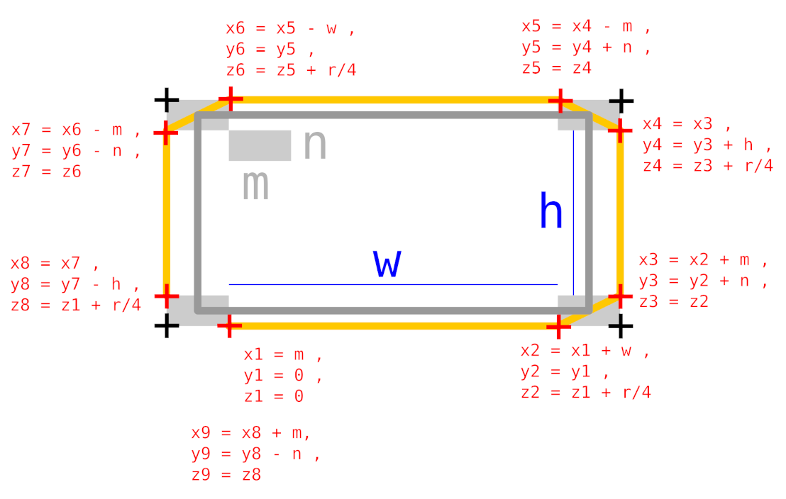 This script generates a simple geometry for a rectangle with sharp corners. The corners are bevelled or chamfered resulting in 8 corners from 4. The 3D model is generating using a Nurbs path object. The default Nurbs path's vertices are all deleted except the middle one. The middle one will be located where the object is located. That is, the Nurbs object's origin is coincident with the middle vertex. With just a single vertex, this script then extrudes vertices for a rectangular loop shape as calculated in the following diagram: