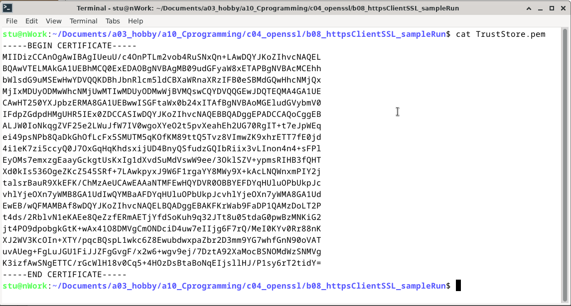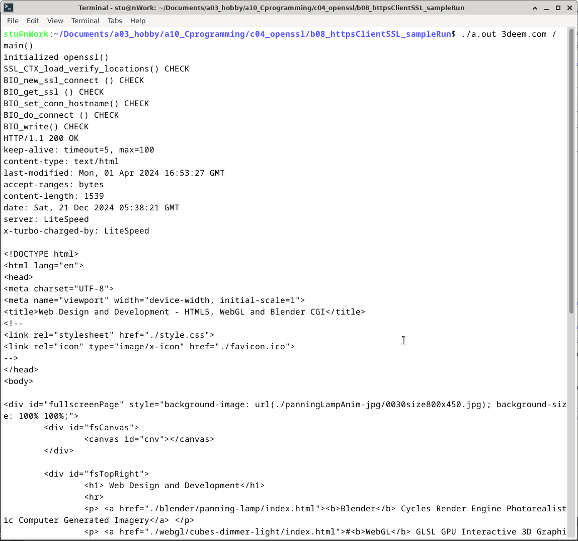 The forth version uses the HTTPS protocol. It uses a self signed certificate. The cert filename is hardcoded as "TrustStore.pem" expecting it to reside in the current directory as the program executable "a.out". All the code is in a single file. It uses OpenSSL's buffered I/O but only reads once. The fifth and final version here breaks up the code into multiple files making it a library and the read function is updated with a multiple read algorithm.