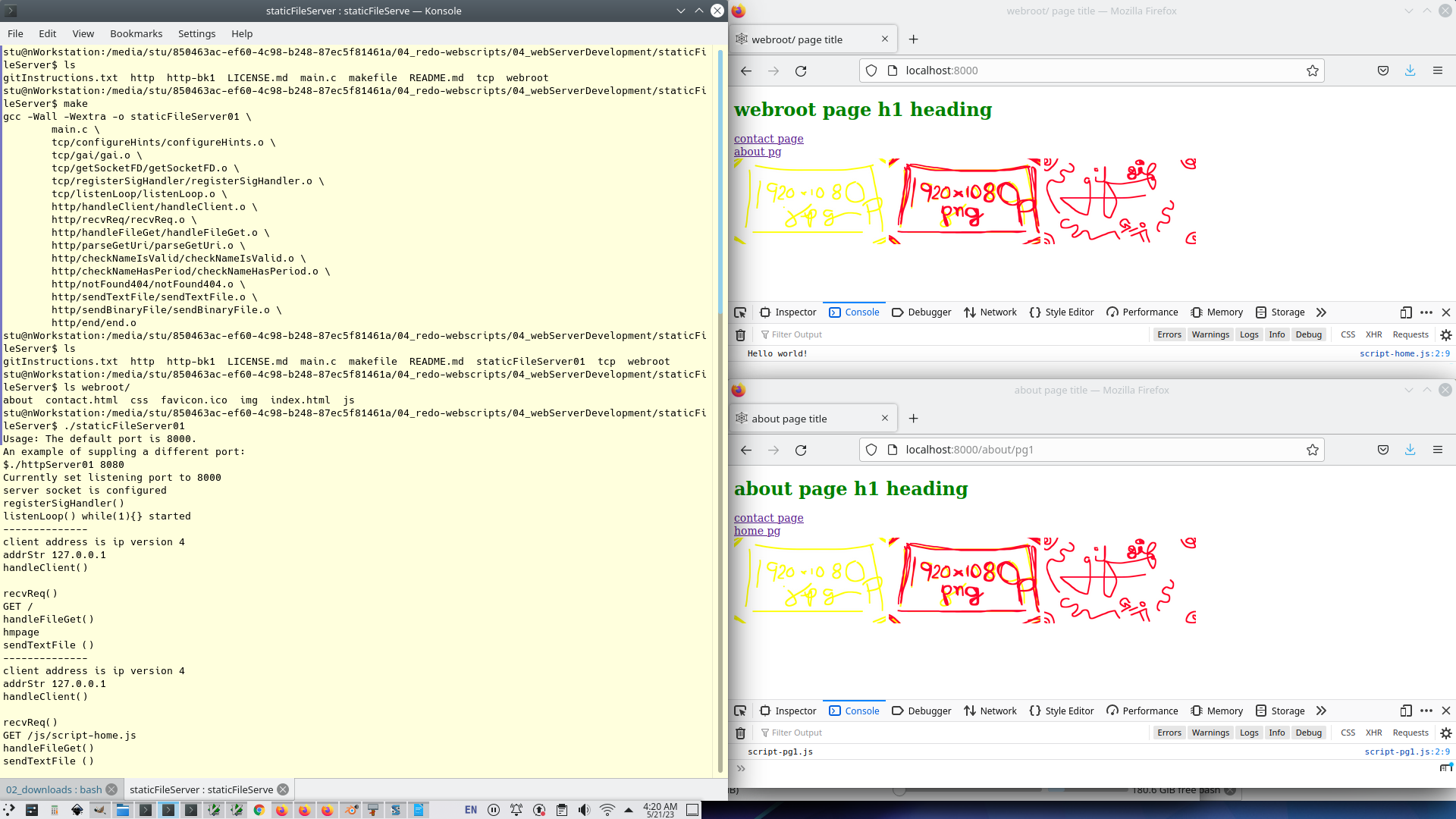 In the bash shell you see I call 'make' which compiles successfully outputing the executable. Then I call 'ls' on the webroot directory showing the website files. And finally I run the executable. On the right there are two browser windows at different paths demonstrating the route handler working. The header is green so we know that the css is served. The console is open with a log from the js files served successfully. The favicon is showing. Browsers usually cache favicons btw so if you are testing you will want to continually clear the cache before verifying that the favicon is served or not. And finally you see png, jpg, and gif images are served. So everything coded is working as expected.