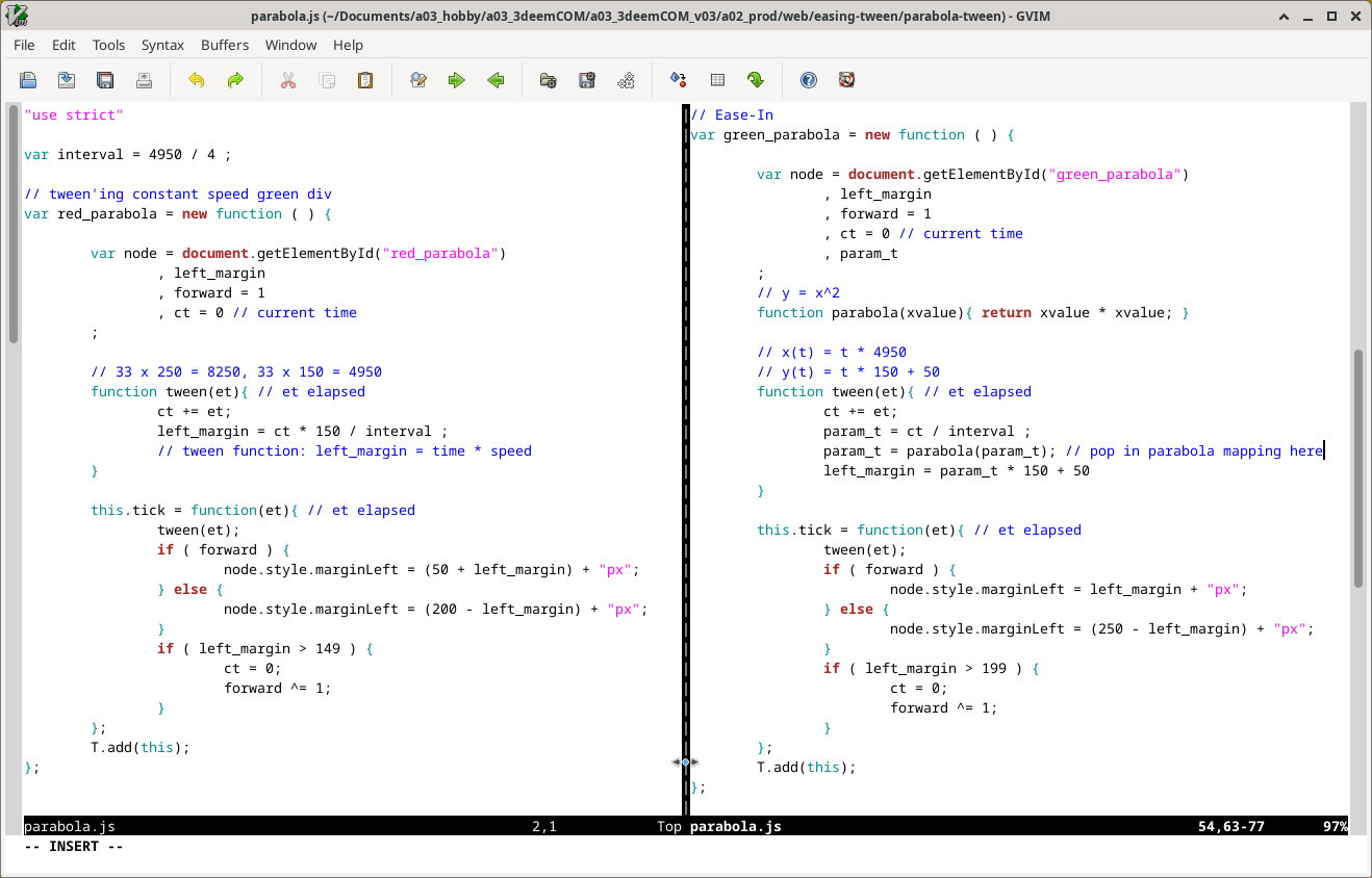 Incorporating the parabola tween function into our animation programming starts with the linear tween programming. With the linear tween, we first calculated the normalized time value, then run the linear tween function. We will keep that all the same. To incorporate the parabola function, we again calculate the normalized time value, then we run the parabola function, and again run the normalized linear function.