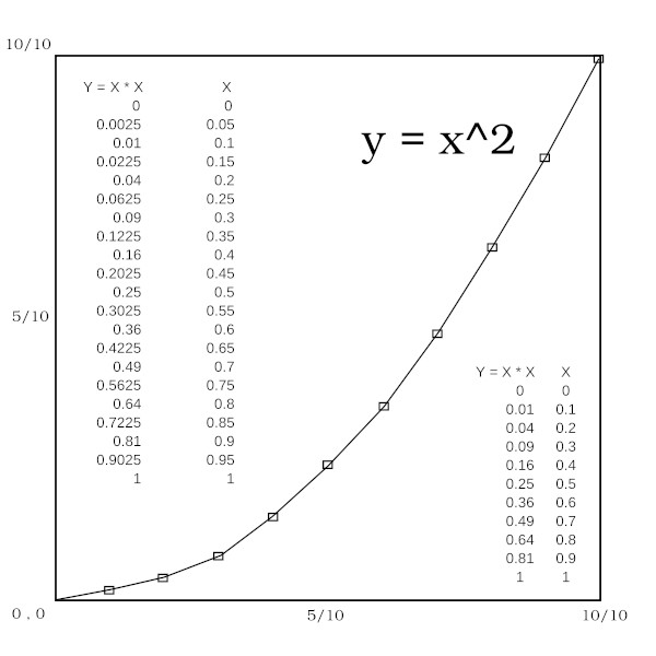 The plot of an Ease-In function starts horizontal and gradually increases it's slope. One such example is the parabola. Here is the plot of the basic parabola: