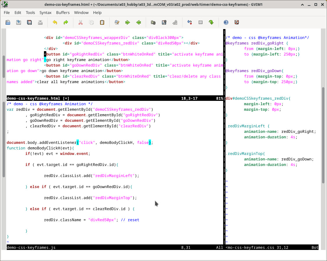 There are two css animation tools available: @keyframes and transitions. We will demonstrate a sample animation performed using each of css @keyframes and transitions and performed manually by programming in javascript.