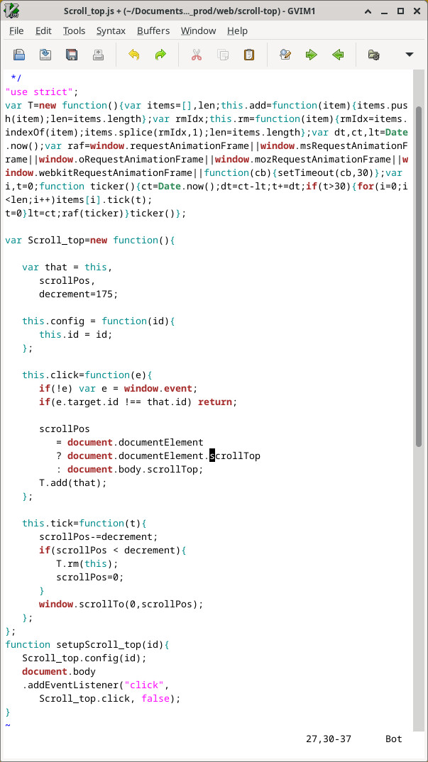 This script offers a convenient footer button for very long web pages that when activated will automatically and quickly scroll up to the top of the page automatically. The DOM includes a window.scrollTop and window.scrollTo() property and method respectively. This script tracks your current scroll position, sets animation rate, and scrolls smoothly to the top. This script will scroll a page smoothly to the top with a click of a button.