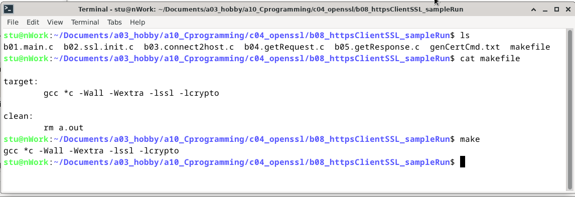 There are five versions here. Download links are at the very bottom of this page. The first version is the HTTP protocol without encryption. In today's internet marketplace, most websites are exclusively HTTPS services including google.com. However, there are plenty websites that still do serve the HTTP protocol. One such website is example.com. You can try the HTTP get request client offerred here for the domain example.com but it will not work with google.com. The next versions build up to using the HTTPS protocol for TLS(transport layer security) using OpenSSL. OpenSSL uses buffered I/O built on top of the standard TCP/IP socket. Before trying to code a working HTTPS web client we work towards a working HTTP buffered I/O code base.