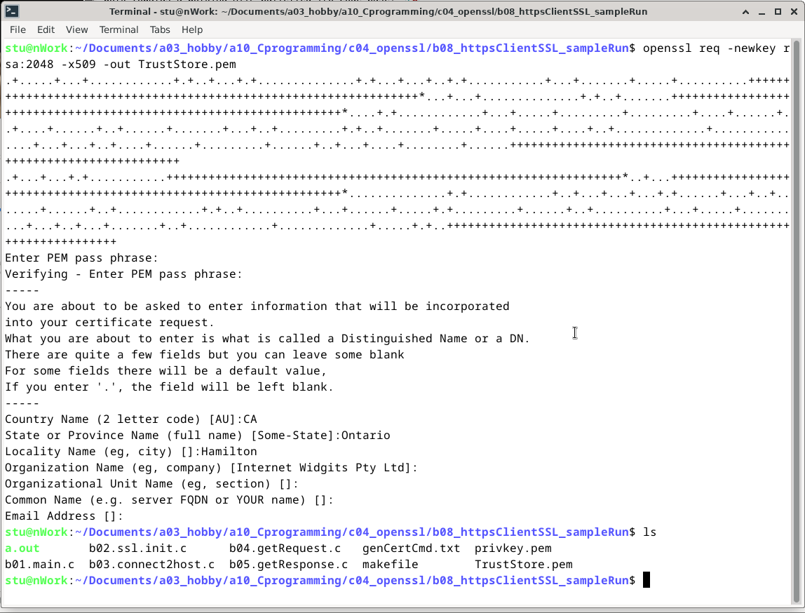 The forth version uses the HTTPS protocol. It uses a self signed certificate. The cert filename is hardcoded as "TrustStore.pem" expecting it to reside in the current directory as the program executable "a.out". All the code is in a single file. It uses OpenSSL's buffered I/O but only reads once. The fifth and final version here breaks up the code into multiple files making it a library and the read function is updated with a multiple read algorithm.