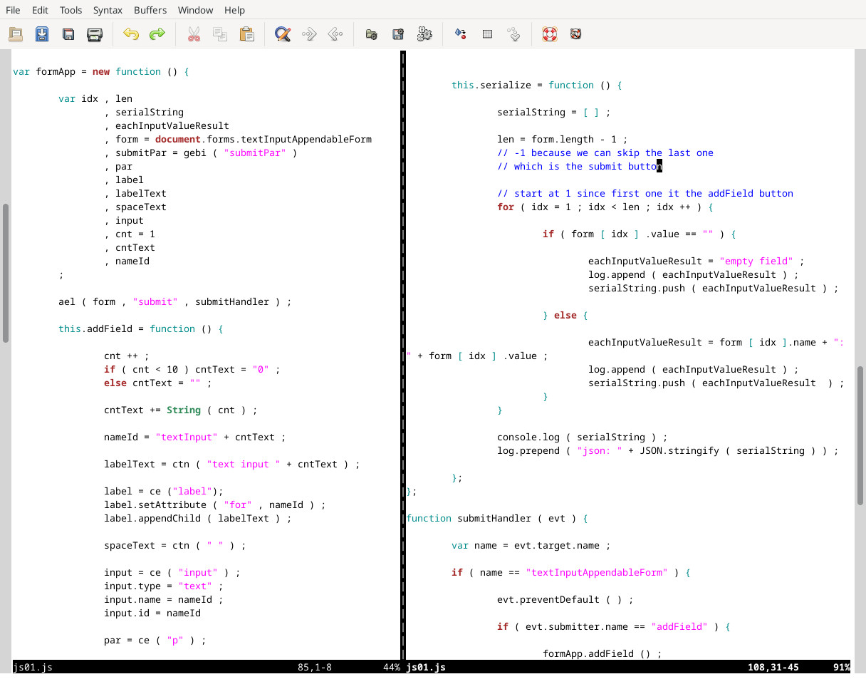 There are two methods of particular interest. First the addField() method. It simply generated the html and appends it to the dom. The second is the serialize() method. That is the work horse and it is just a for loop. There is nothing to it. The DOM api automatically takes care business for you by building forms elements into an array. You just need to loop thru it.