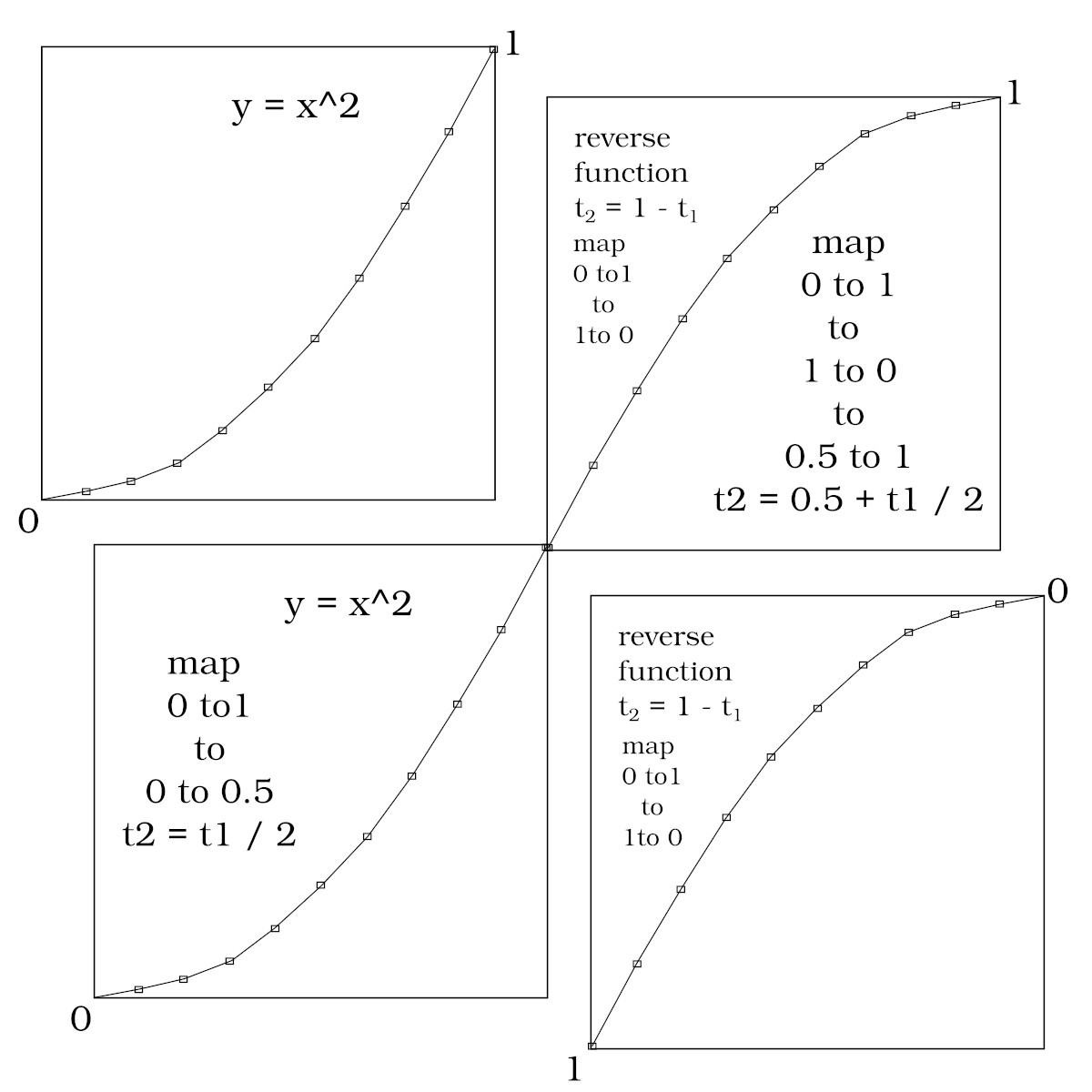 View the plot of the basic parabola function leading into the reverse of the same parabolic function. So we have to map the forward parabola function 0 to 1 to 0 to 0.5. Then we have to map the forward parabolic function to the reverse parabolic, then map the reverse parabolic from to 0.5 to 1.